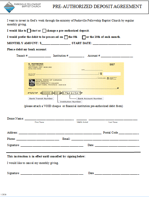 Download this form and submit it to the church for a withdrawal to be made automatically from your bank account.